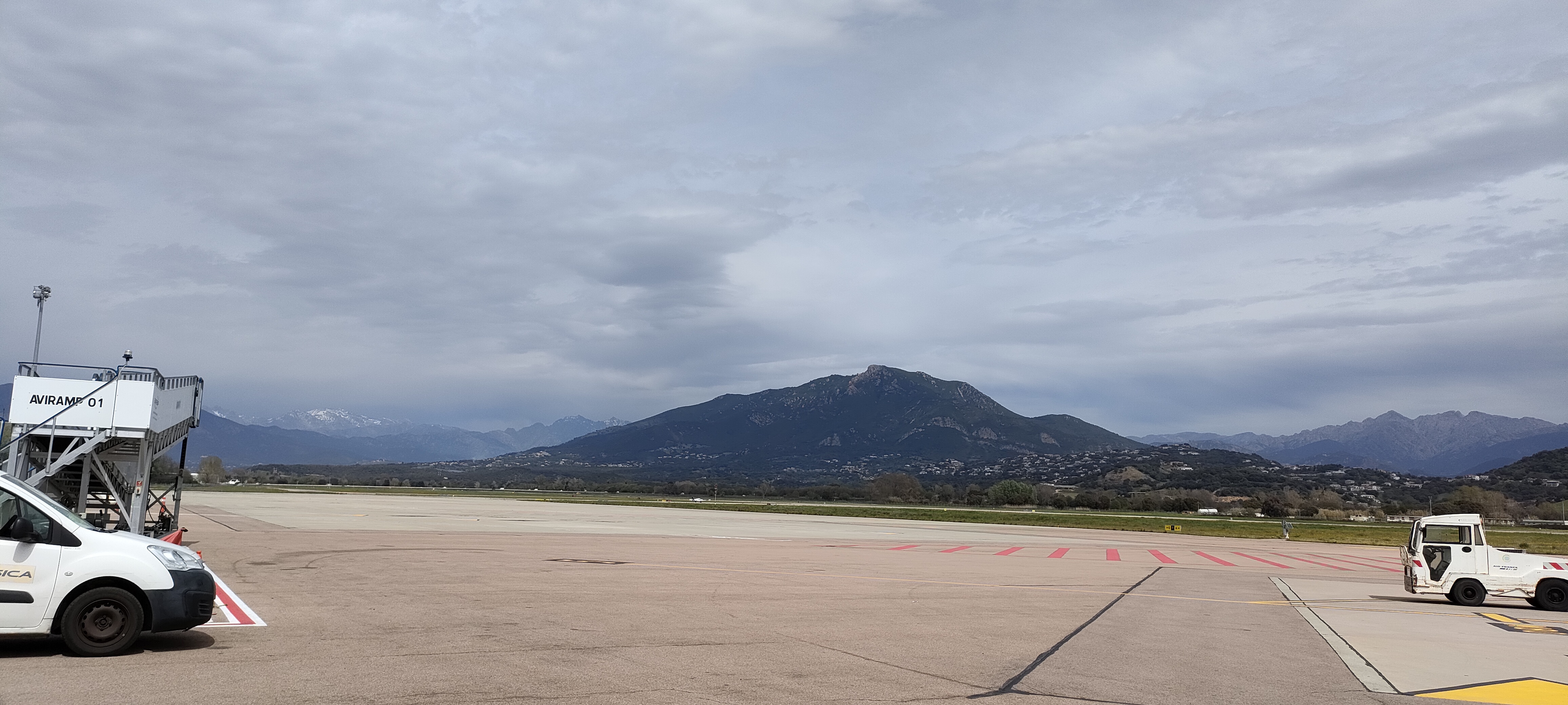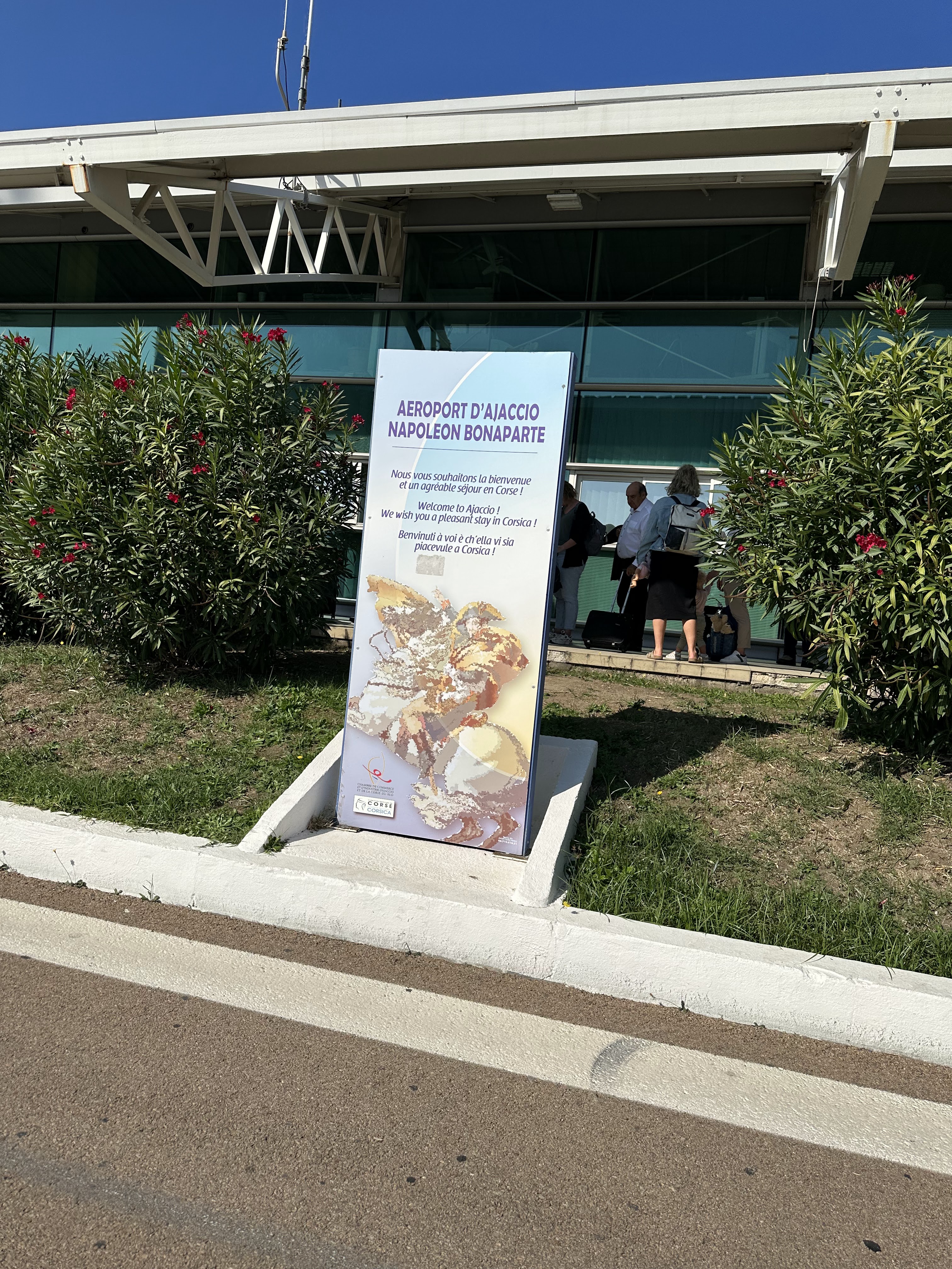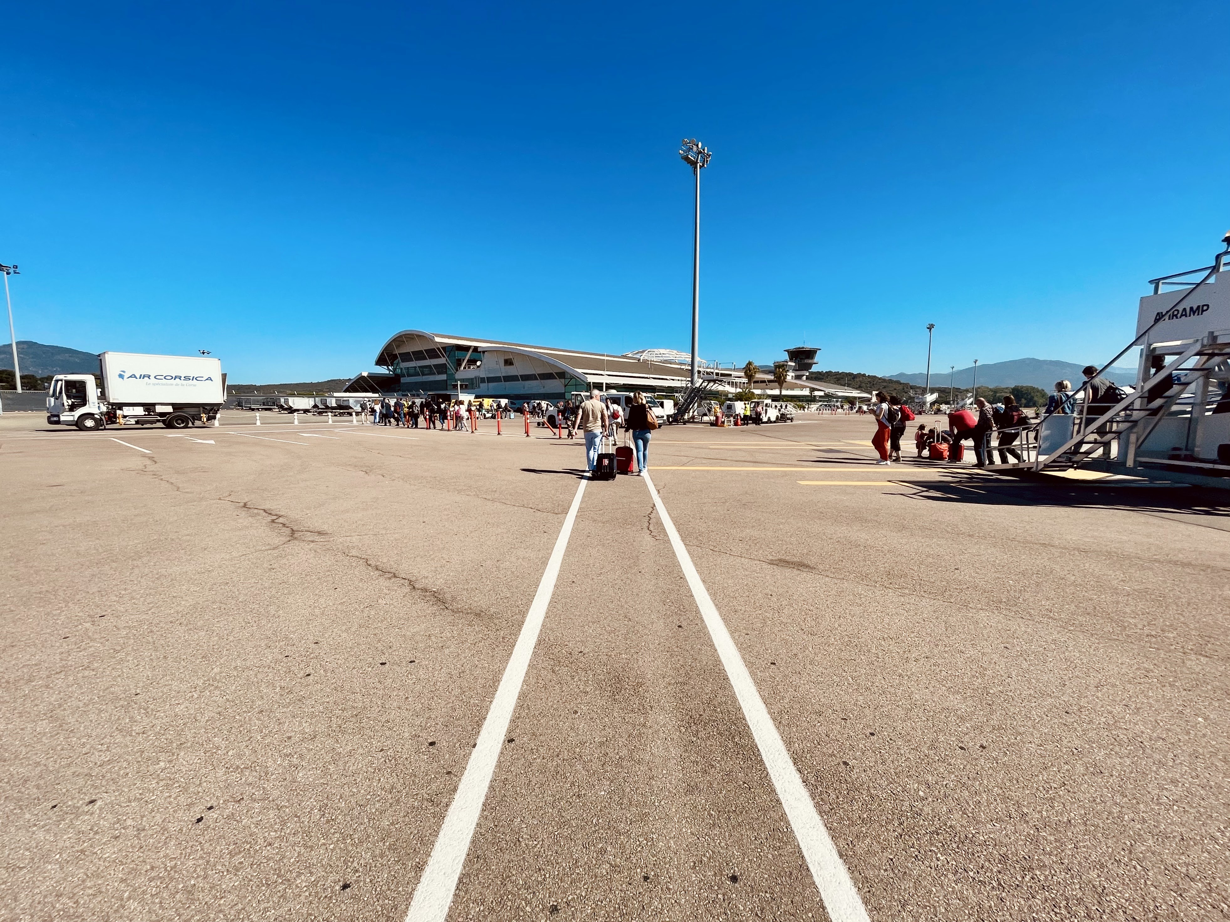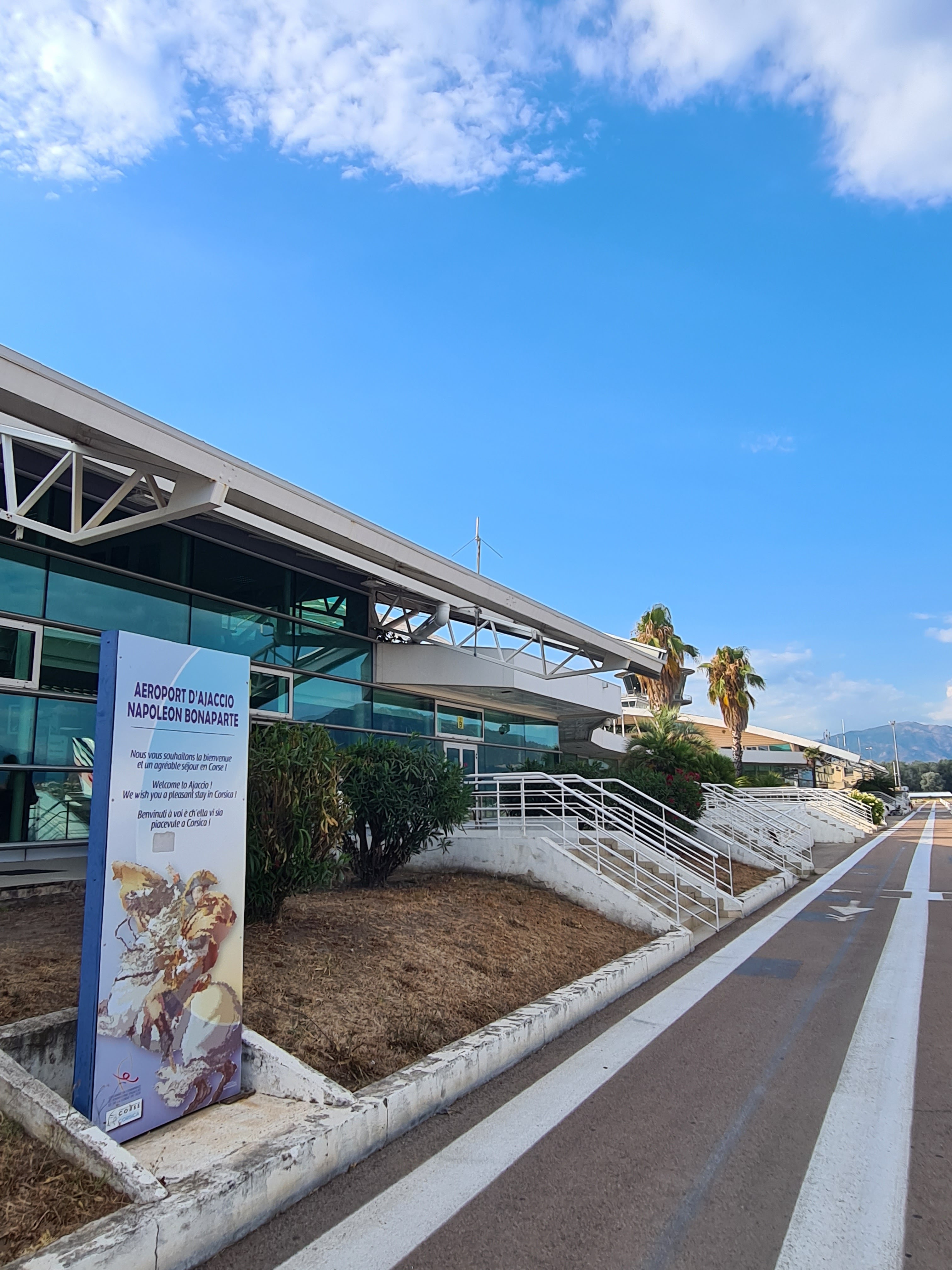 L’avion atterrit 20mn a l’avance exceptionnel, le capitaine et l’équipage d’une sympathie exceptionnelle air corsica, l’aéroport d’une propreté impeccable, les mesures de sécurité pour le covid 19 sont bien appliqué, l’avion atterri face à un paysage paradisiaque, il faut bien le préciser, un service de location de voiture se trouve sur le parking à 1mn ce qui est parfait, le soleil est au rdv….