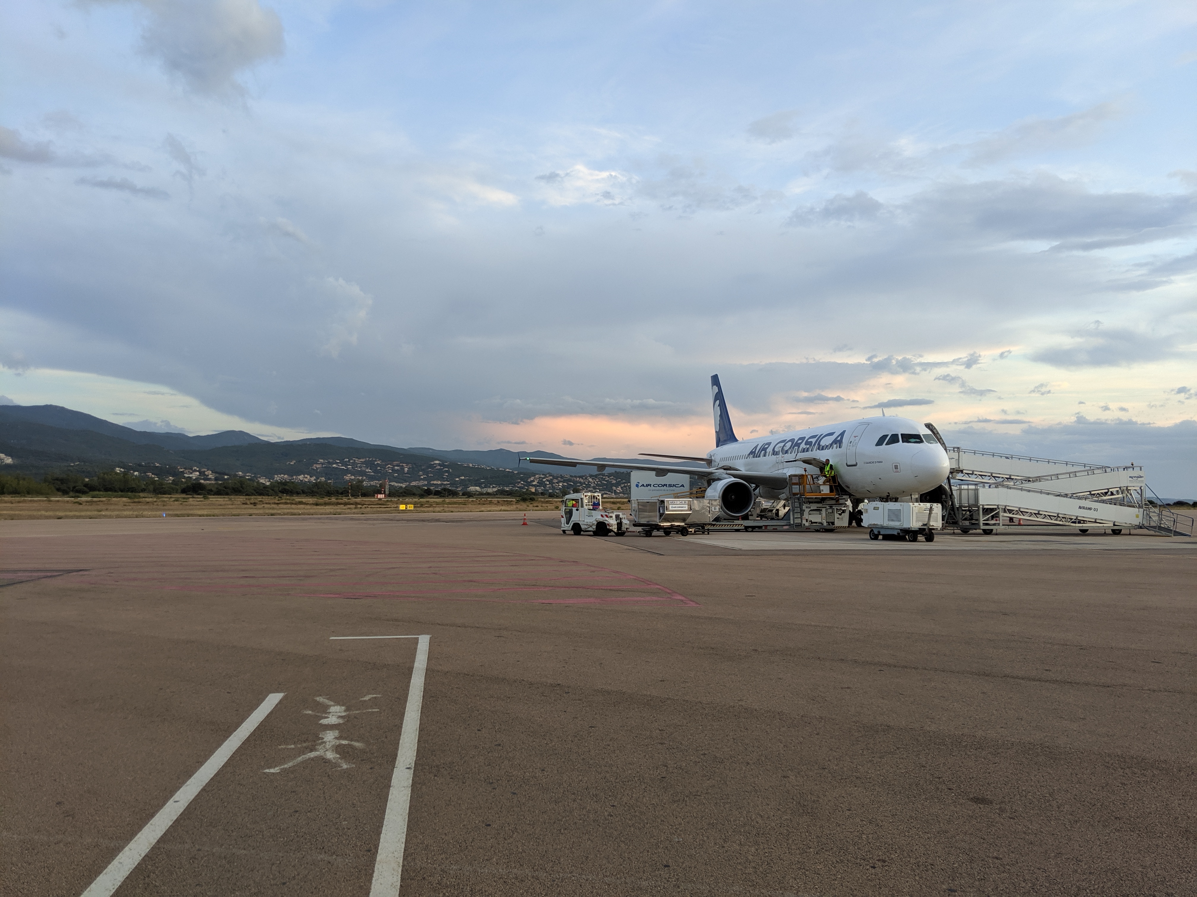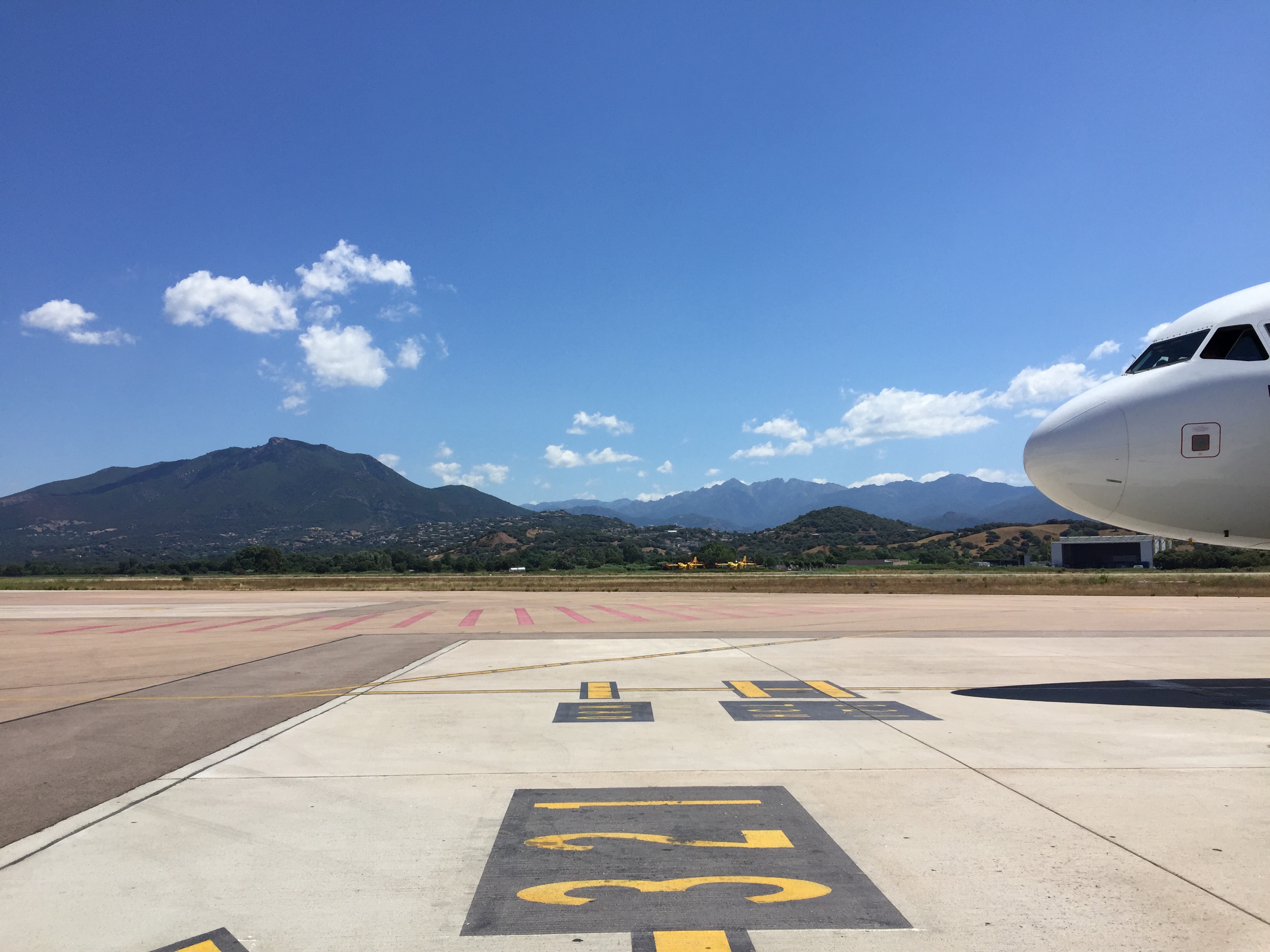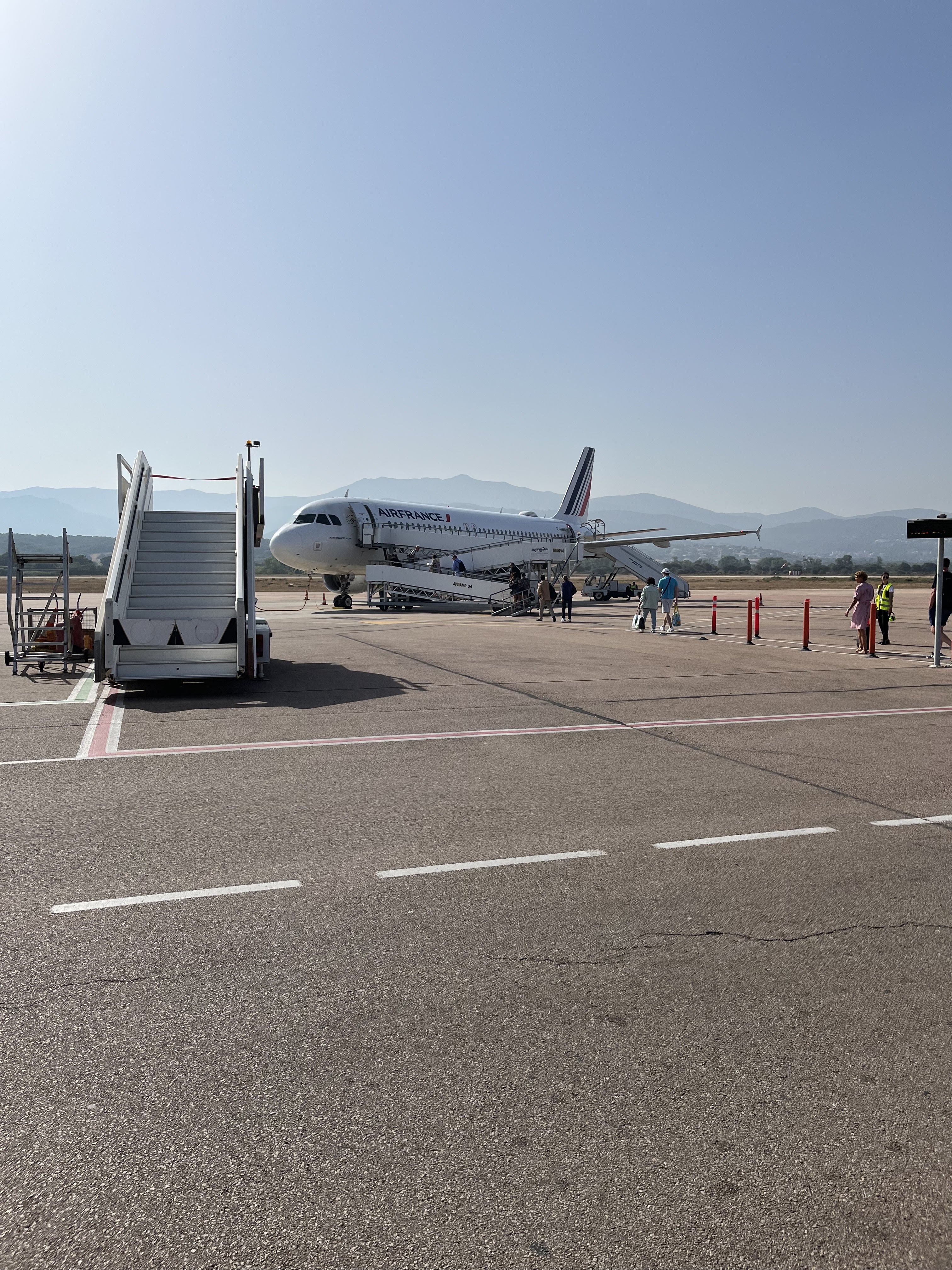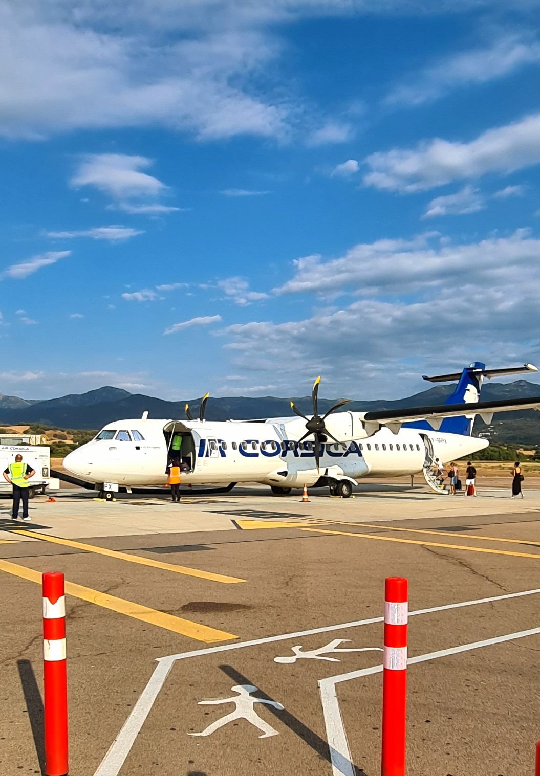 L’avion atterrit 20mn a l’avance exceptionnel, le capitaine et l’équipage d’une sympathie exceptionnelle air corsica, l’aéroport d’une propreté impeccable, les mesures de sécurité pour le covid 19 sont bien appliqué, l’avion atterri face à un paysage paradisiaque, il faut bien le préciser, un service de location de voiture se trouve sur le parking à 1mn ce qui est parfait, le soleil est au rdv….
