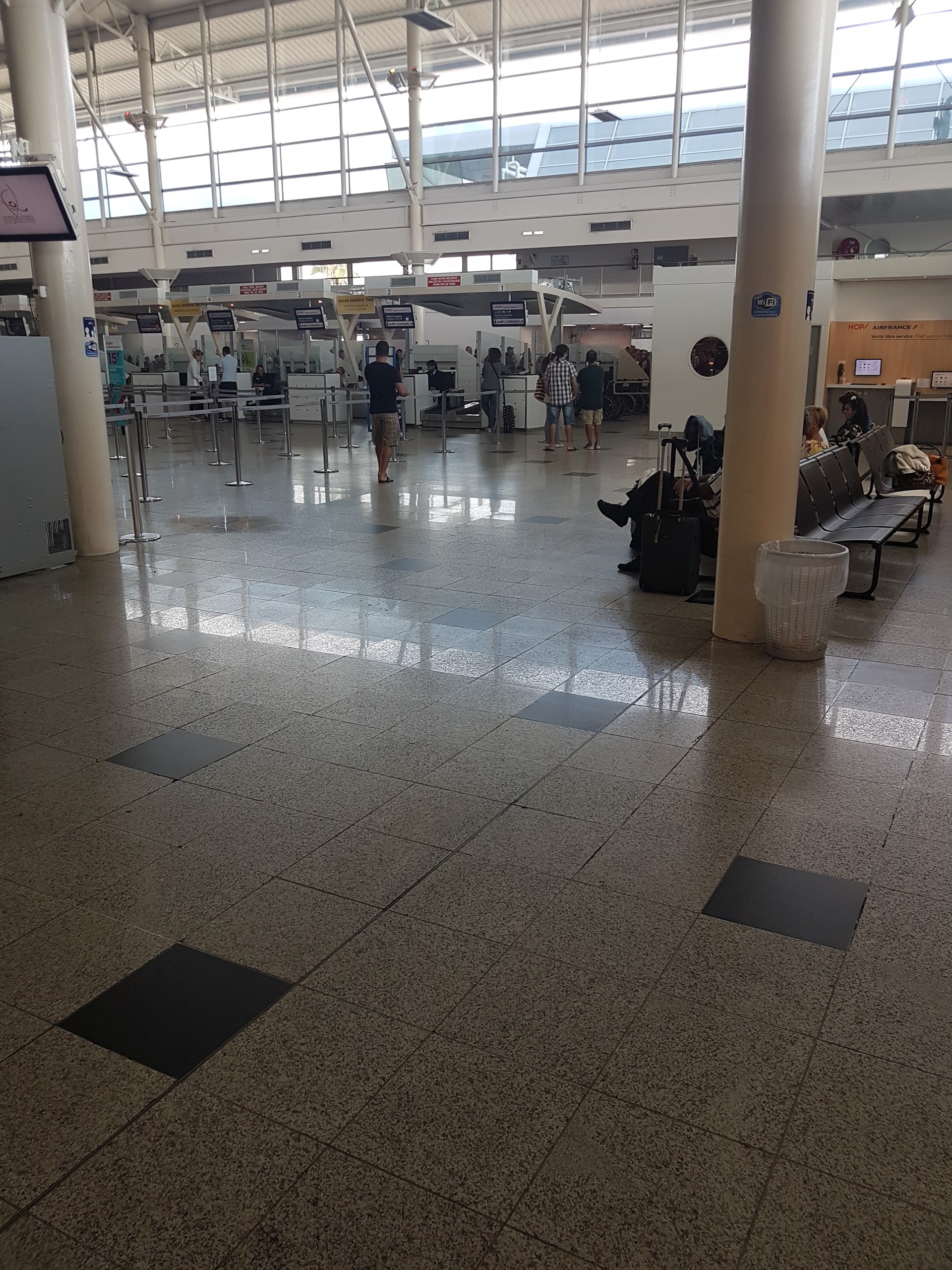 Petit aéroport comparé à la forte affluence..... Organisation floue..... Et surtout très en colère par le contrôle de sécurité où l'agent voulait que je fasse demi-tour pour enregistrer un pot de miel de 250g,alors que mon ami lui est passé sans problème avec un pot de confiture de même contenance mais contrôlé par un agent plus clément !!!! Politique à 2 vitesses pffff et pot de miel corse à 8€ à la poubelle!!!! Lamentable quel gaspillage