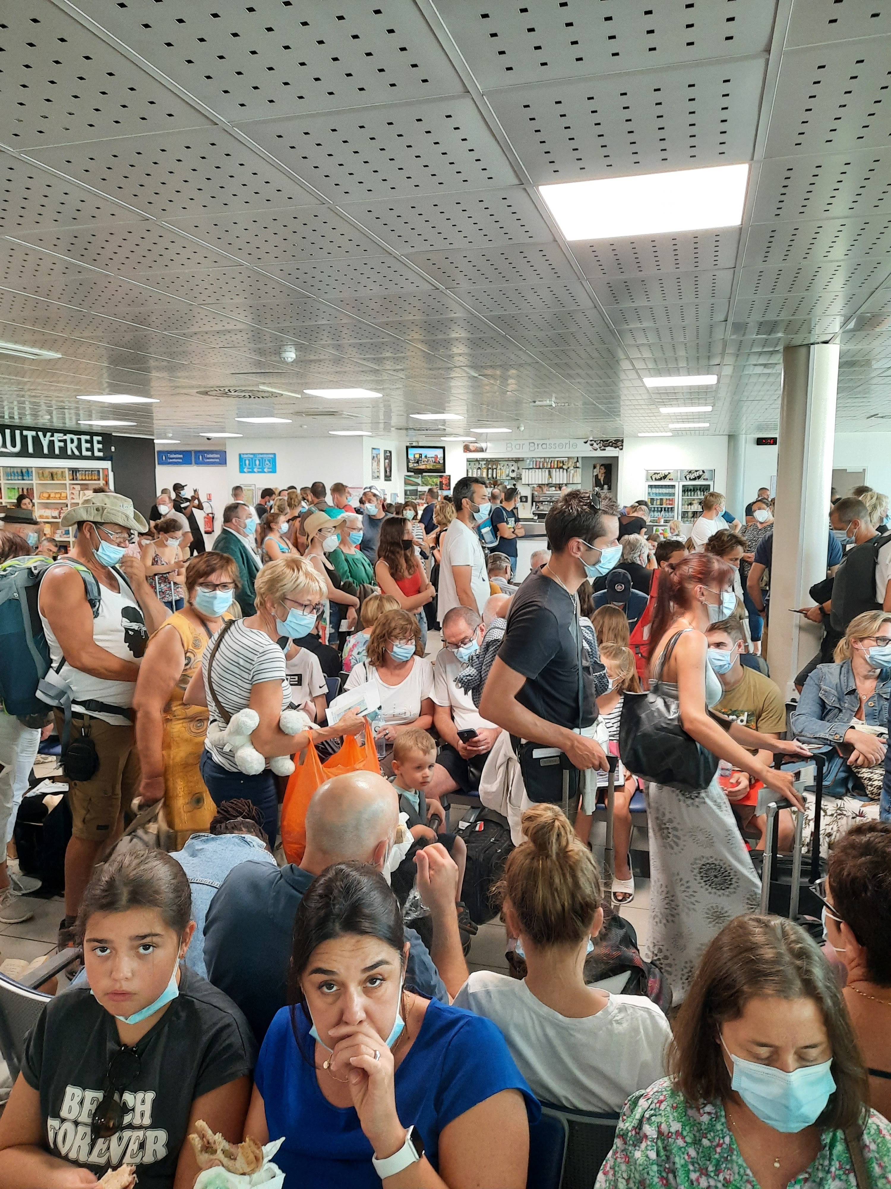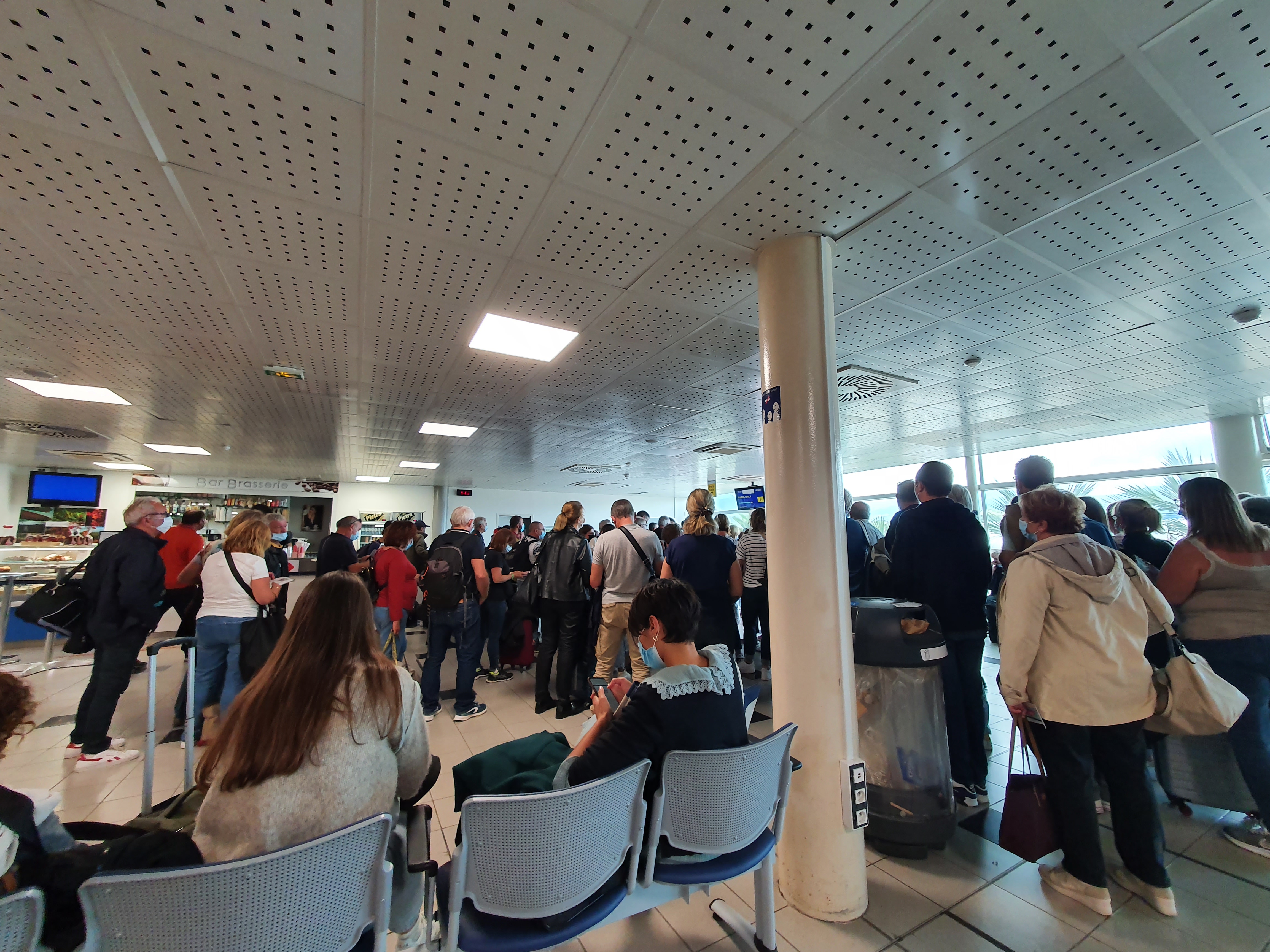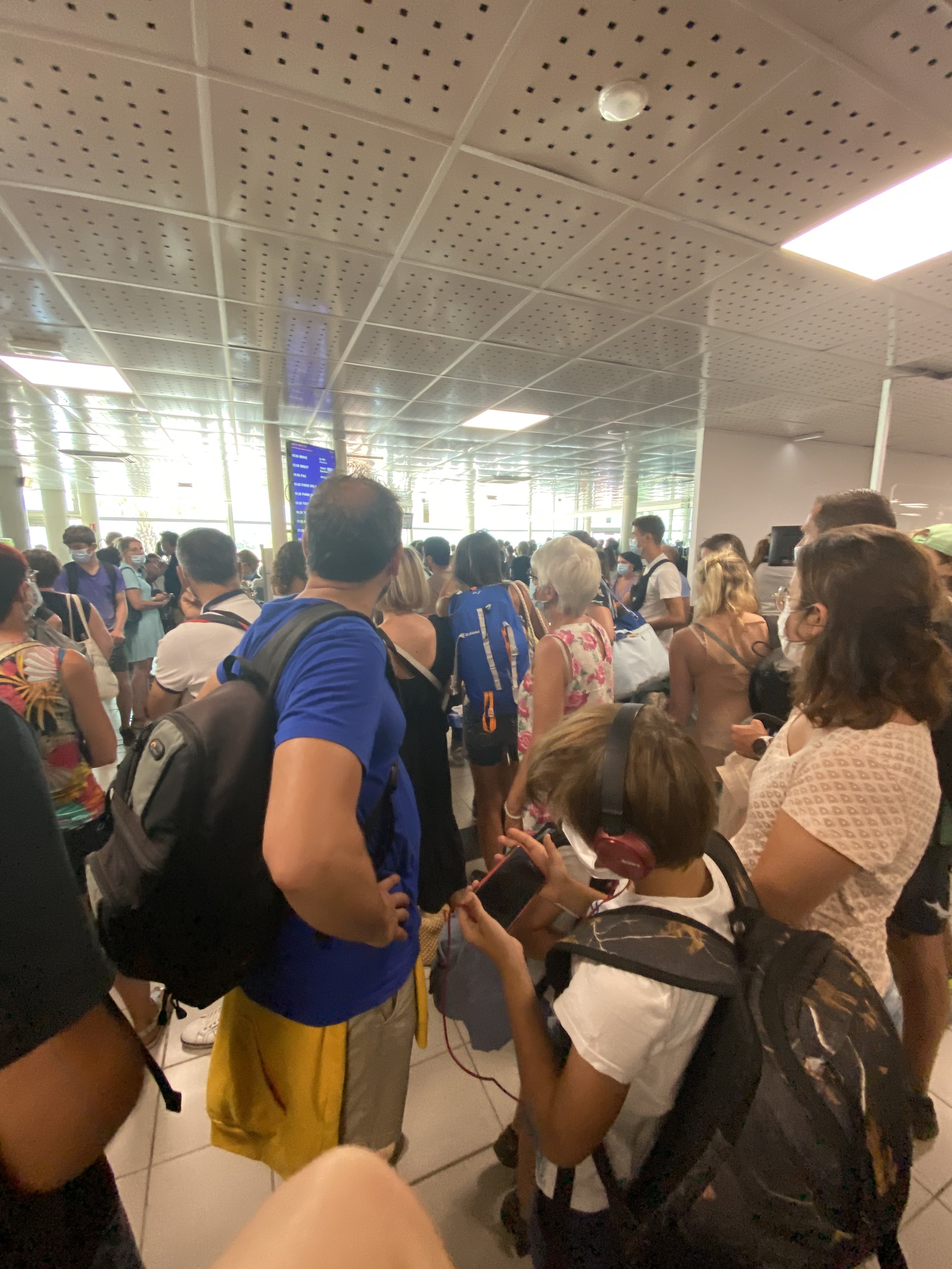 Jamais vu ça de ma vie ! 20 ans que je prends l'avion. Un brouhaha assourdissant, des enfants à même le sol tellement il manque de place, une chaleur insoutenable, des personnes au bord du malaise. Un message retentit régulièrement afin de nous dire de bien préserver les distanciations sociales #Covid19 sans pour autant nous permettre de le faire, le message indique également de bien garder le masque chirurgical (il est donc étonnant de voir une majorité des employés ne pas respecter cette règle)